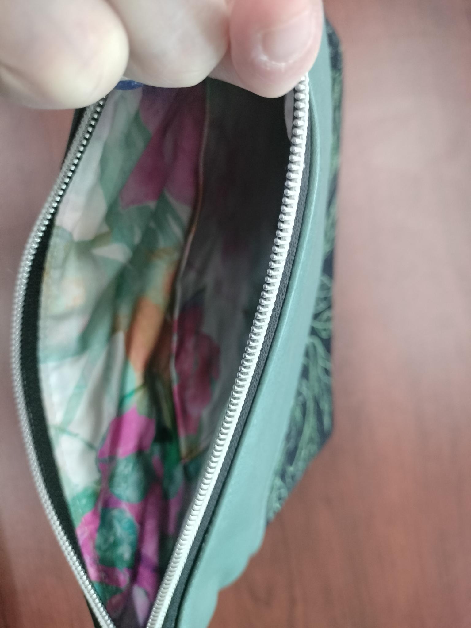 This bag measures 10.5″ wide x 9.5″ tall. It has a zipper opening, is fully lined and has a pocket in the lining as well.I hope you enjoy this interesting clutch bag!
