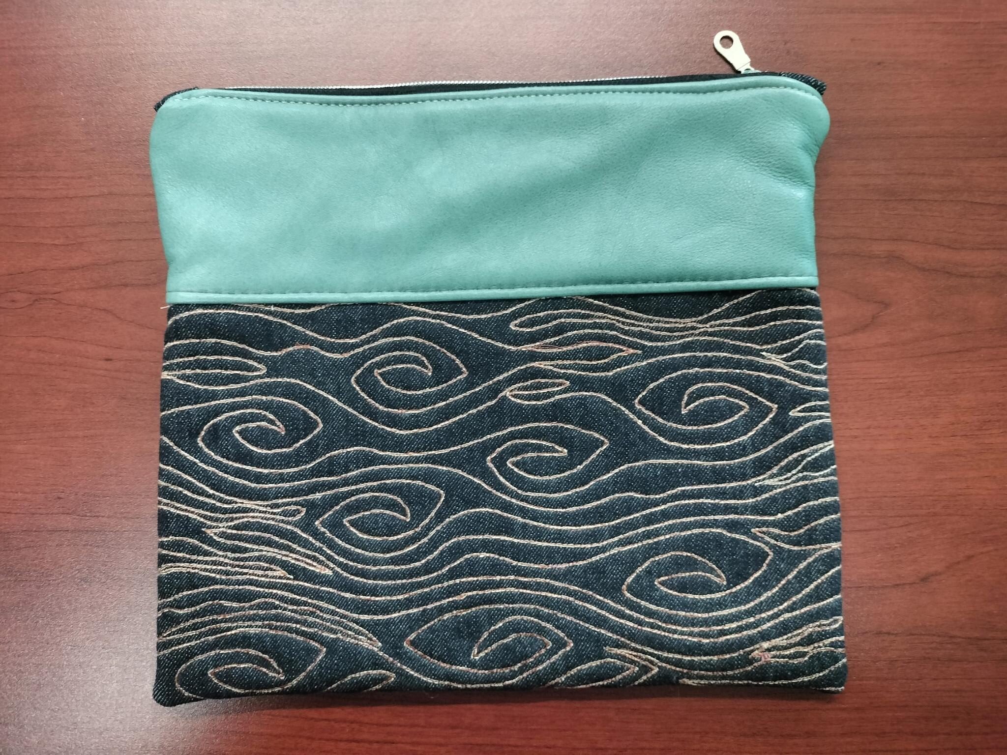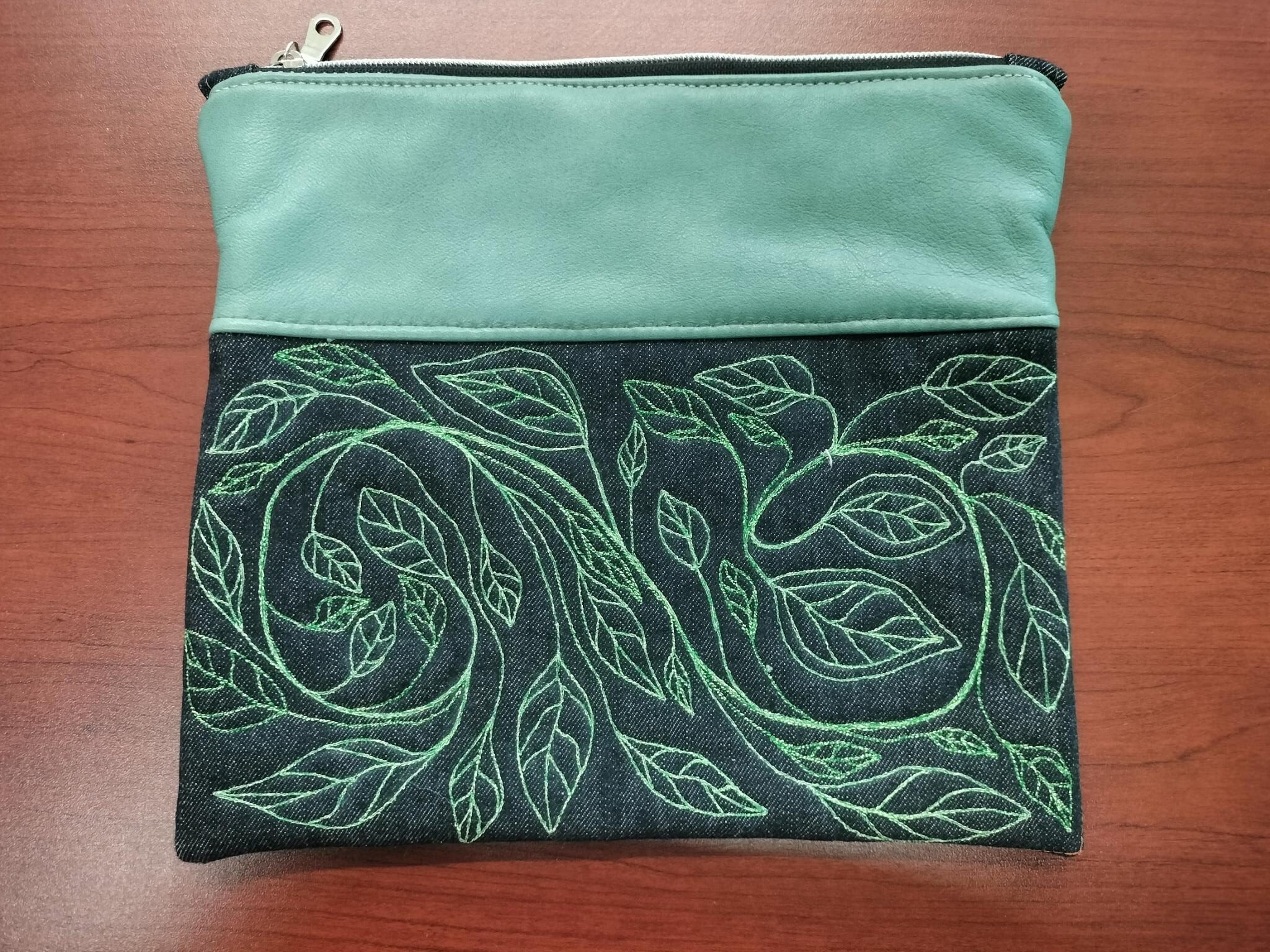 I made these fun little clutch bags with scrap leather and some denim I had used to build my freemotion embroidery skills. All embroidery work was done on my vintage single needle straight stitch Singer 15-88. Leather stitching was done on my Mini Thompson portable walking foot machine. Very vintage machine for sewing sails on boats!